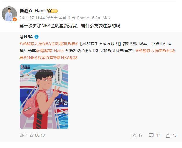 杨瀚森在个人社交媒体发文:第一次参加NBA全明星新秀赛,有什么需要注意的吗?网友在评论区回复:怎么秀怎么来。